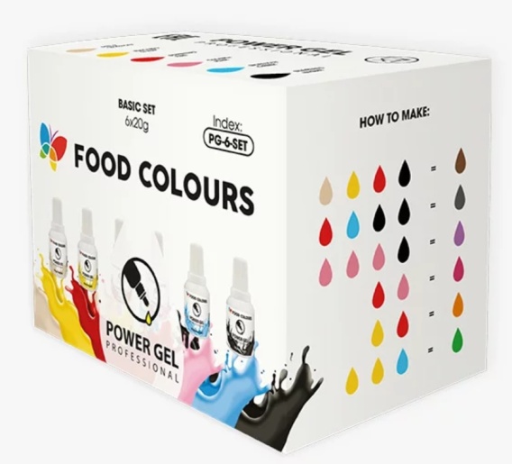 Zestaw żelowych barwników spożywczych PowerGel od Food Colours obejmuje 6 bazowych odcieni: różowy, beżowy, żółty, czerwony, niebieski oraz czarny. Dzięki wysokiej koncentracji pigmentu już niewielka ilość produktu pozwala uzyskać wyraziste, głębokie kolory. Barwniki doskonale nadają się do barwienia masy cukrowej, kremów na bazie śmietany, lukru oraz makaroników. Butelki wyposażono w praktyczny zakraplacz, który umożliwia precyzyjne dozowanie. Na opakowaniu znajduje się także wskazówka, jak łączyć kolory, by otrzymać nowe, niestandardowe odcienie.