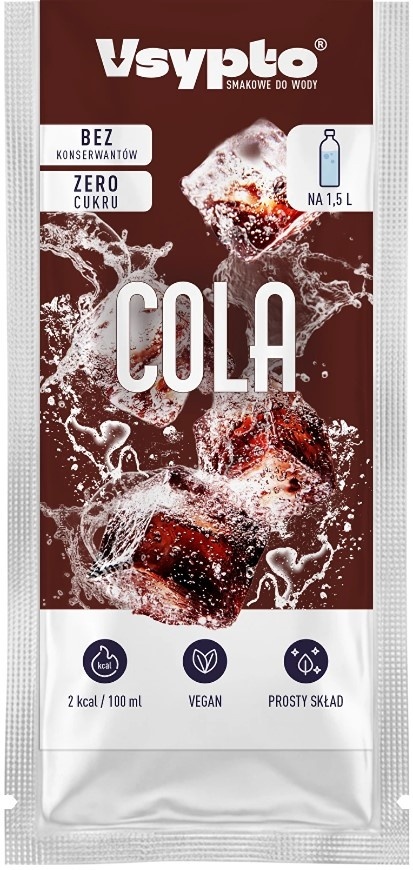Vsypto o smaku coli - napój ma intensywny, słodko-karmelowy smak, inspirowany charakterystycznym aromatem żelków o smaku coli. Smak jest dobrze wyczuwalny. Wypij i poczuj lekko cukierkowy smak, bardzo przyjemny w odbiorze, bez gorzkich nut. Napój nie jest przesadnie słodki, dzięki czemu świetnie sprawdzi się jako dodatek do regularnie pitej wody. Jest idealny do posiłków. Z dodatkiem lodu jest orzeźwiający i niezastąpiony podczas upalnych dni.