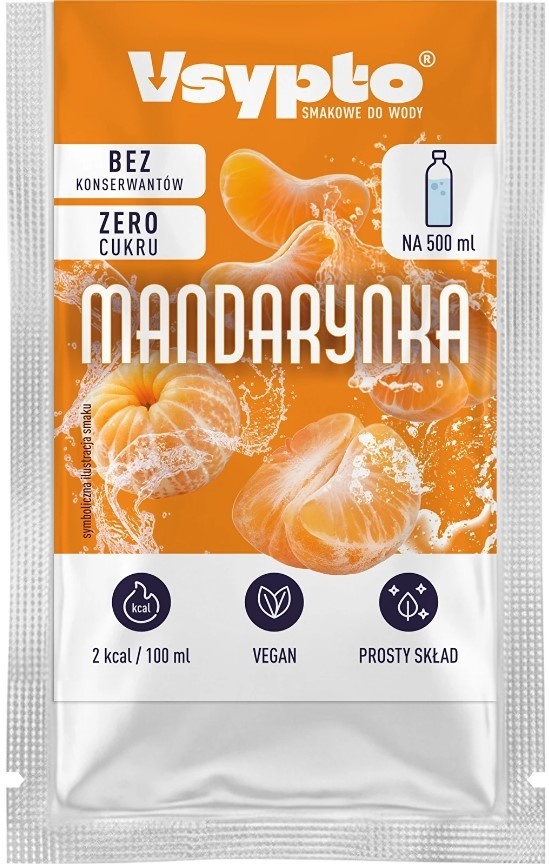 Vsypto Mandarynka - idealny dla fanów owocowych smaków. Napój ma słodki, cytrusowy smak, dzięki czemu staje się orzeźwiający. Smak mandarynki jest dobrze wyczuwalny. Nie jest przesadnie słodki, dzięki czemu świetnie sprawdzi się jako dodatek do regularnie pitej wody. Napój idealny do posiłków. Z dodatkiem lodu jest niezastąpiony podczas upalnych dni.